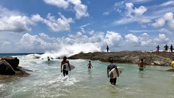 Beginners might prefer the shore break closer to the beach, where waves are friendlier.